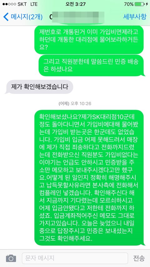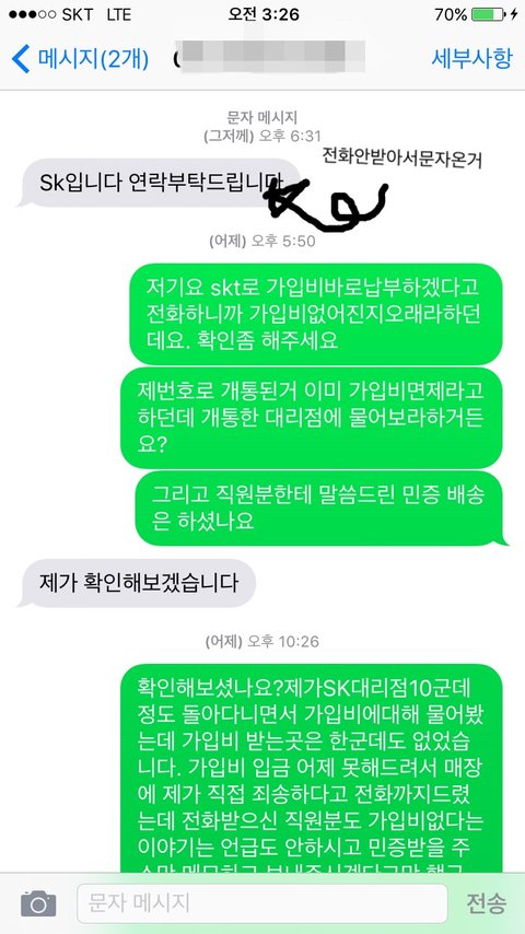 근데 오후 6시쯤? 저한테 계좌적어주셨던 직원분이 전화가 왔는데 제가 모르는번호 안받아서 안받고 기다렸는데 바로 문자오더라구요 SK대리점이니 연락좀 달라고. 그 문자 읽자마자 다시 전화가 와서 받으니 아직 입금안됐다고 빨리보내라고 하시는겁니다. 그래서 제가 아까 매장에 전화해서