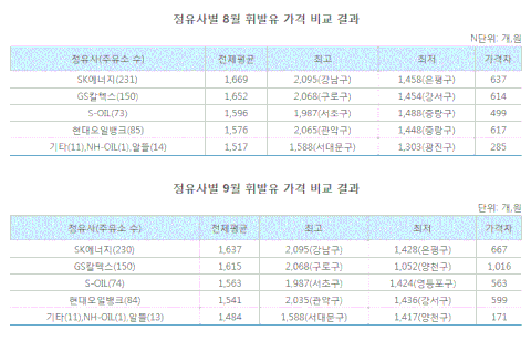 # 오피넷 정유사별 석유제품(휘발유) 가격 비교