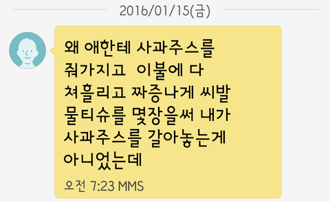 얼마후 이런 문자(첨부이미지) 오네요. 이런 비슷한 경우가 몇차례 있었지만 그럴때 제가 대꾸하면 쌍욕이 오는걸 알기에 별 대꾸는 안하고 있는데 어찌할 바를 모르겠네요. 제가 몰 그리 잘못하고 아직 어린애는 몰 그리잘못한건지도 솔직히 모르겠습니다. 첨인데 당황스러워 올리는게 아니고 이런 비슷한 경우가 많고 그럴때 마다