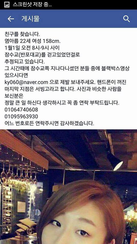 15일 강남경찰서와 실종자 가족에 따르면 21살 여성 염아름 씨가 지난 1일 오전 8시 서울 잠수교 인근에서 돌연 사라졌다.