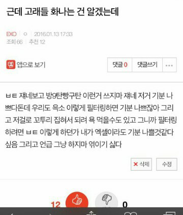 현재 많은 엑소엘들이 반성 중이며 앞으로는 엑소 팬톡에서 타 그룹들을 일체 언금할 것입니다. 어쩔 수 없이 언급을 해야할 상황일 경우 그룹 명 사이에 숫자를 넣는 ( 엑12소 ) 등 제대로 된 방법으로 필터링 할 것임을 약속드립니다.