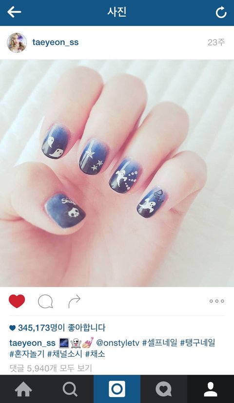태연이 인스타 특징 : 그림에 소질이 있어서 탱화백으로 불릴 정도로 그림 사진도 많고, 여자라서 네일이나 뷰티도 많이 올림. 그리고 팬들과 소통이 많고 ! 존예셀카까지..