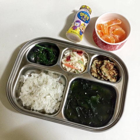 시금치나물 / 크래미코울슬로 / 새우동그랑땡 / 미역국