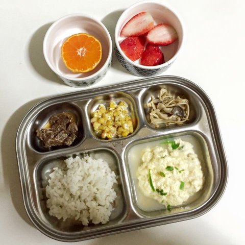 소고기장조림 / 콘옥수수 / 버섯볶음 / 계란찜 입니다.