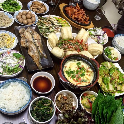메뉴는 고추잡채 / 조기구이 / 삼색전 (호박전 , 송이버섯전, 부추오징어전) / 제육볶음 / 계란찜 / 봄동무침 / 샐러드 / 밑반찬들 이구요.