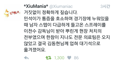 어제 아풋대경기장에서 시우민 부상소식에 다들 놀랐을거야.. 시우민이 격투기선수의 태클에 경기장 바닥을 몇바퀴나 구르고 한참을 일어나지도못했는데 매번 출연자 부상으로 문제되고있는 아육대측은 전문적인 의료진이나 구급차도 배치안해서 제대로된 응급조치도 못받게하고 아픈사람 붙잡고 인터뷰 강행이나 했다니 너무 화난다ㅠㅠ