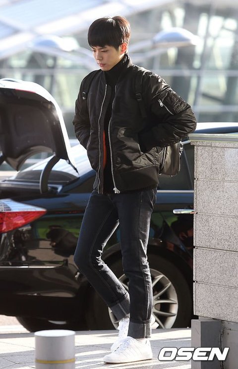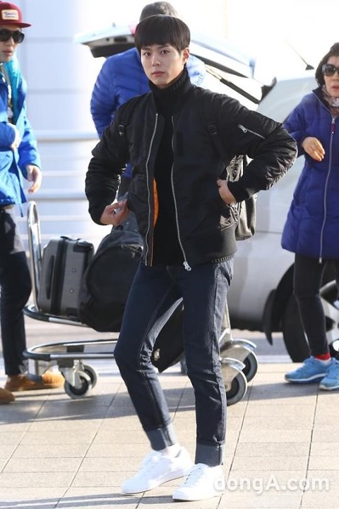 박보검씨는 요즘핫한아이템 항공점퍼와 케이스위스의 화이트 스니커즈로