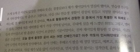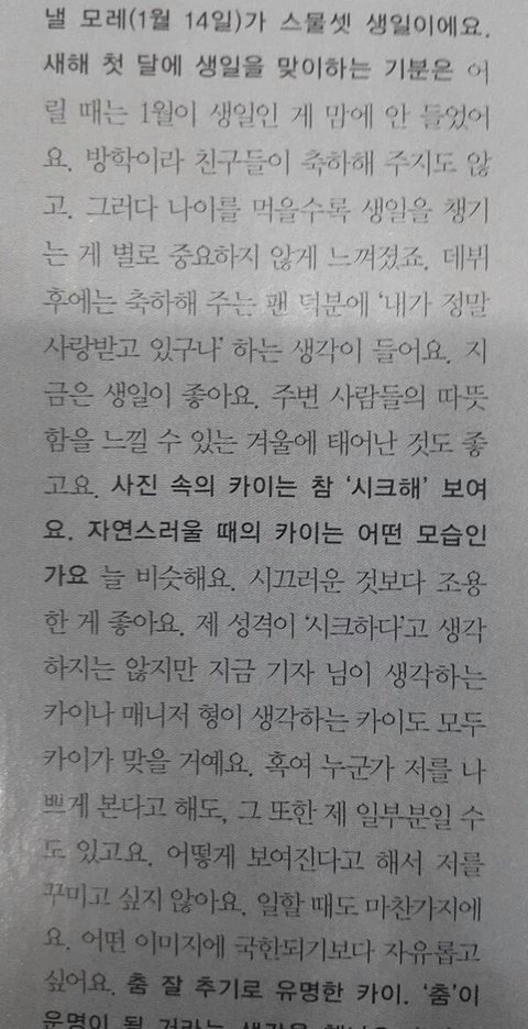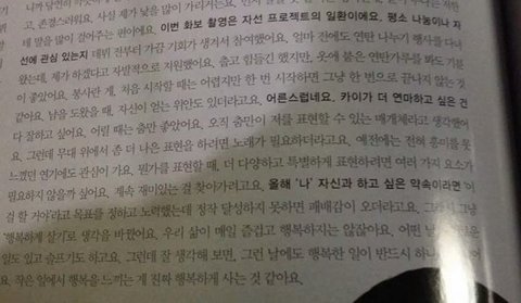 누군가 자신을 바라보는 시선이 어떤모습이든 그것도 카이일거라는 종인이 말이 인상깊네 다시한번 느끼지만 종인이는 자존감이 참 높은것같아 남들이 카이를 보는 다양성을 인정하면서 카이 종인이의 본모습도 사랑하는 멋진남자다