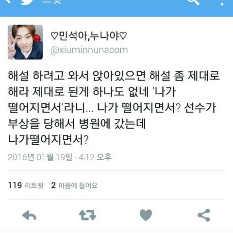 또한 그 상황에서 괜찮아요? 도 아닌 괜찮죠?라는 식의 질문을 하였으며 시우민의 부상이 역전의 발판이 될 수 있다는 멘트를 날림