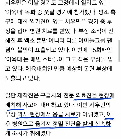 엑소 멤버 시우민이 풋살 경기에 참여했고 경기 도중 상대팀 태클에 걸렸음. 4~5바퀴 구를 정도였고 걷지 못할 정도로 심각한 상황이였음