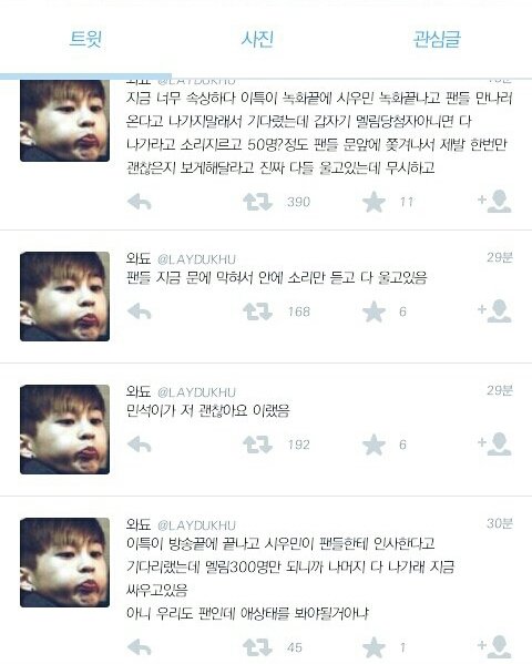 시우민이 병원에 간 이후 팬석이 다운되고 우는 분위기이자 급하게 카메라를 돌리고 정리하심. 또한 팬분들에게 지금 퇴장할 경우 불이익이 있을 거라며 협박.