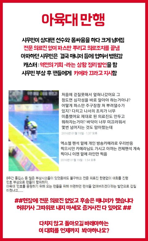 시우민이 부상당했을 때 의료진 전혀 없었고 선수가 요구하자 그제서야 에어 스프레이를 뿌렸음. 여기서 중요한 건 그 상황에 에어 스프레이를 뿌린다는 건 불난집에 부채질하는 꼴이라는 것임. 그 말은 즉 응급처치 조차도 제대로 안 됐다는 말