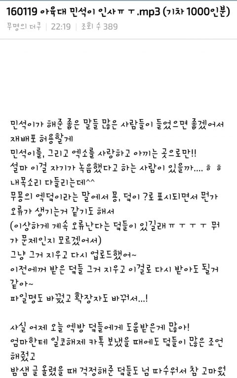 또 추가)) 댓글 계속 확인하고있어~ 언제든지 보내줄테니까 미안해하지말고 댓글 달아줘 웅녀들!! 원글써주신 분이 하신 말씀처럼 민석이가 해준 좋은 말들 더 많은 사람들이 들었으면 좋겠어서 그러니까 원하면 꼭!! 언제든지!! 이메일 남겨줘!!