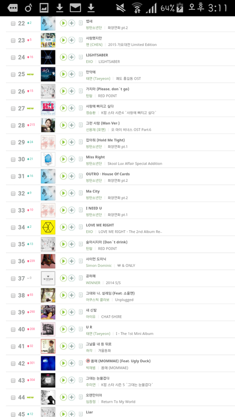 4시 차트...런 포함 공백기 스밍 목록 14곡 모두 급상승 차트에 있음....ㄷㄷ