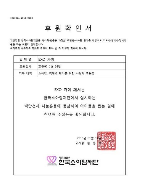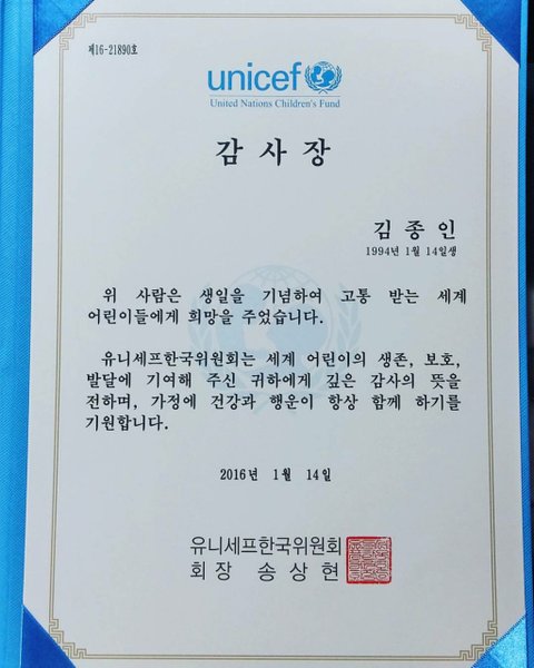 유니세프에서 김종인(카이)에게 감사장 수여
