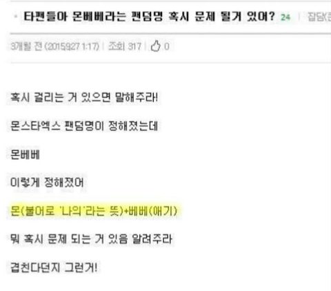 하지만 일반 대중들은 아가라고 생각하기 때문에 문제가 생깁니다. 몬스타엑스분들과 몬베베를 만드신 분도 뜻이 아기라고 말한 바가 있습니다