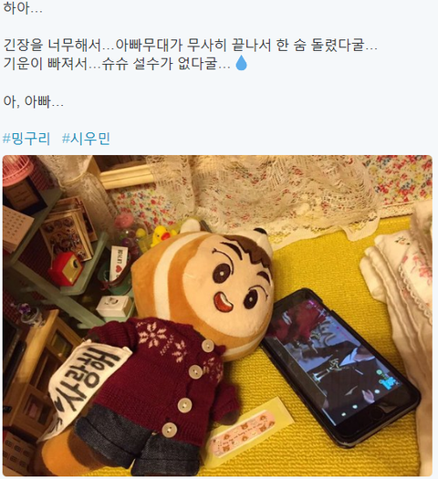 얼마전에 어떤 웅녀가 올려준 거 보고 찾아가 봤는데, 일본 밍구리 슈슈의 얘기를 번역해서 올리는 곳인가봐 그렇지? ㅋ 슈슈의 골디 응원기 재미있어 ㅋㅋㅋㅋ 사실 난 나이도 있고 인형에 대해선 큰 관심 없었는데 새삼 관심이 생김 슈슈가 서울 나들이를 한다니 또 뭔가 재미난 글이 많이 올라올듯 해 민석이 팬분들은 참 아기자기하신 분들 많아서 좋아 좋아!!!!