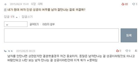오랜만에 로그인을 했다가 알림이 있었는데 너무 황당합니다.이전에 여자 인생은 남자만 잘만나도 성공이라는 글에 남긴 덧글에 대댓이 달렸길래 확인했더니 저런 내용이더라구요.물론 중요합니다. 결혼이란게 한평생 남은 인생에서 동반자를 찾는 것인데 중요하지 않을 수가 없죠. 다만 인생에서의 전부는 아니고, 결혼보다 훨씬 높은 꿈을 가지고 살고 있는 제 입장에서 여자는 남자만 잘 만나도 성공한다는 말이 이렇게 굴욕적일 수가 없더군요.나만 보고 바람 안피는 좋은 남자를 만나 사는건 결혼을 성공하는 것이지 인생을 성공하는 것이 아닙니다.남자 입장으로 돌려 말했더라도 과연 저런 말을 당연시할지 의문스럽습니다.이게 아직까지도 보편적인 여성, 혹은 사람들의 인식인가요?세상에는 결혼은 그저 인생에서 부가적인 요소이고 확고한 목표가 있는 여성도 많다는걸 좀 알아줬으면 싶네요.