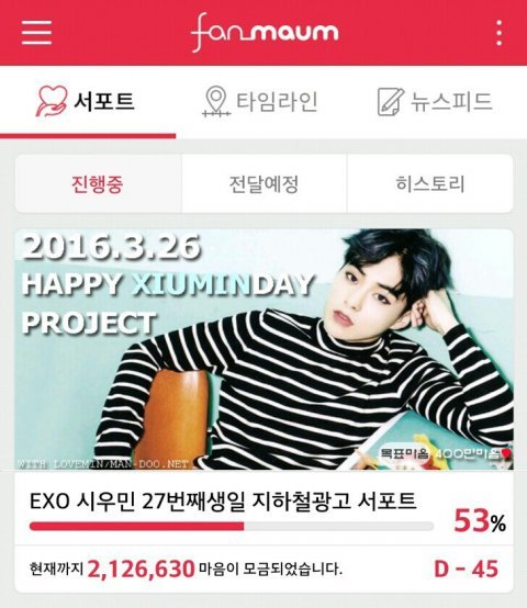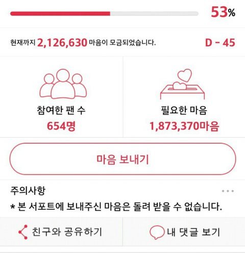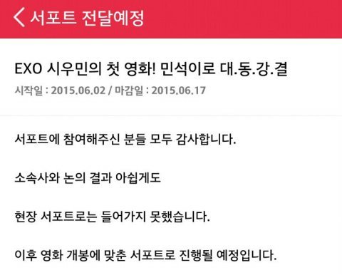 예전에 했던 시우민 김선달 영화 팬마음 서포트 326만 마음 다 채웠었는데 전달이 되지 않은 모양입니다. 영화가 개봉이 되면 진행될 예정이라네요. 아직 모르시는 분 계실까봐 공지사항 올립니다.