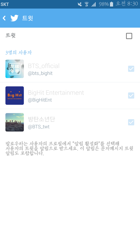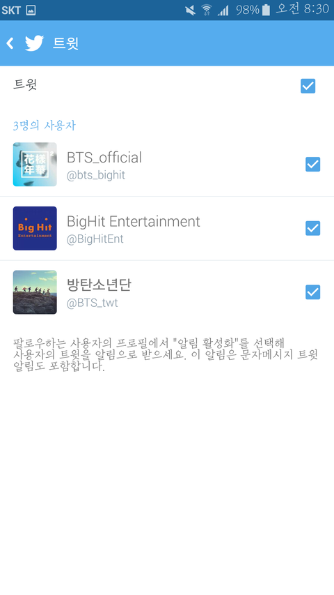짹 알림요새 계속 안오길래 봤더니 업데이트하고 나서 자동으로 트윗알림이 비활성화 되게 있었어 저거 눌러서 활성화해야해....
