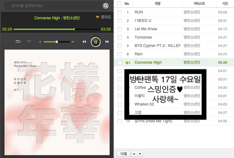 일단 스밍인증이 악용됄 가능성이 있으니까 돼도록이면 날짜랑 팬톡이름 (방탄팬톡) 꼭쓰고 만약 사담이나 글올릴때에는 스밍인증 첨부해서 올리자... 아 그리고 돼도록이면 스밍중에 "런" 플레이 중일때는 캡쳐안했으면 좋겠당.... 혹시 어떤애들이 날짜랑 팬톡이름 지워서 공카등업할때 악용할지 어떻게 알아...ㅠㅠㅠㅠ 아 또, 공백기스밍안돌리고 있는 이삐들이 있으면 친절하게! 우리 이삐답게 설명하자ㅋㅋㅋ 스밍안하고 있거나 상단바에 스밍없는애들은 인증해주기 전까지 대답하지 말구ㅠㅠㅠ 기존아미와 유입아미들도 이점 꼭 지켜주길바래~ 우리 깨끗한 팬톡만들어 가자 모두 열스해!♥♥ 알려뷰 빡빡