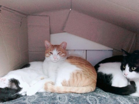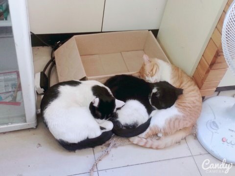 이렇게 좁은 스크래쳐에 굳이 세마리다 낑겨서 잣답니다ㅋㅋ더운여름이었는데 덥지도 않았엇나봐요~