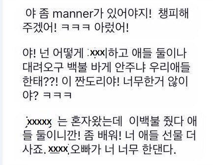 과연 이런 문자를 보내는게 정상인건지.. 쌍둥이라 더 줘야했던건지.. 4인가족 데리고 가면 머릿수 맞춰 밥값+로 내야한건지.. 저 사람의 태도가 여전히 너무 당당해서 정말 우리가 잘못한건가..잘못 살아온건가..헷갈릴 정도라 의견 좀 여쭙고 싶네요.