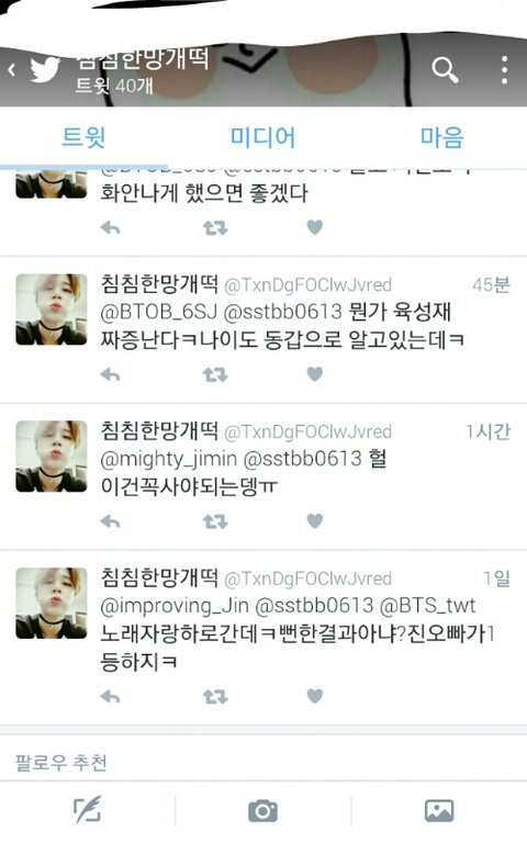 쟤 왜저럼 졸라 언제적 뒷북을 치는거임..? 저게 왜 기분이 나빠 미친년 근데 쟤 그냥 정신 이상한 초딩같은데 인기투표하고 지글에서 글도 일주일 전부터 시작했던데 그리고 팔로워도 1명없고 갑자기 석진이가 1등이라느니..이건 좀 그냥 이상한 팬 아님?