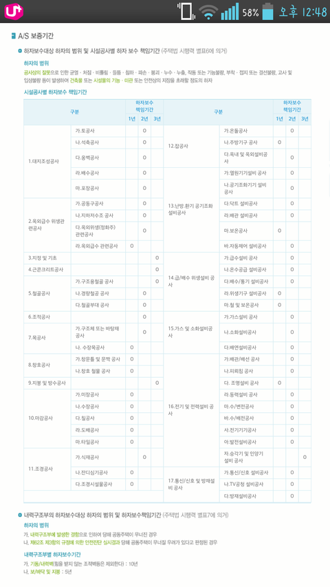 안녕하세요. 일산 덕*동 신* 아 파*리에 살고있는 입주자입니다. 평소에 아무렇지도않던 안방 화장실 변기부스 타일벽이 갑자기 금이가고 무너져내리기시작했습니다. 오늘아침에 확인하신 어머니께서는 급히 관리사무소에 연락해 사정설명 후 방문요청을 드렸는데요, 전화 후 30분이 지나도록 아무 연락이없어 다시 전화했더니 전화받는 여직원 왈 '하자보수기간끝나서 우리가가봤자 아무것도해줄수없다.' 며 방문자체를거절했습니다. 그런데 그 말투가 어찌나 교묘하게 빈정대는 투인지, 웬만해선 남에게 언성 높이지 않으시는 저희 어머니께서 화가 나 관리소장과의 통화를요청하셨습니다. 전화받은담당자역시 소리질러가며 자기들은해줄게없다며 이리핑계 저리핑계, 당연히 방문도 거절. 저희집만그런거라면 저희문제겠지만,같은아파트 해당동내 몇집씩 같은문제로 전화를걸어왔다면 이건 분명 각 세대의 문제가아닌 아파트문제아닌가요? 아파트입주민의불편과 민원을해결해야하는 관리사무소직원들의 안하무인적태도와 싸가지없는말투에 저희어머니 급기야 분해서 눈물까지 보이셨습니다. 관리사무소측은 하자보수기간은 지났다고주장하고 확인결과 홈페이지에도 하자보수기간명시가되어있지만 애당초 해당회사의 공사 말 부실공사와 그에기인한 하자가 문제가되어 시끄러웠었고, 아시다시피 아파트라는 주거공간의특성상 핵쓰레기폐기물급공사가아닌이상 유의적하자발생기간은 일반적으로 3년 경과 후 부터인데, 그럼에도 하자보수기간은 고작 1에서 3년. 최대 하자보수기간이3년이라는것도 이해가되지않고, 우리 입주민의 관리비로 녹을먹는 관리사무소직원들의 모르쇠로일관하는태도와 예의없는태도도 불순하기에 어떻게든 사과를받고 문제를해결하고싶어 글을올립니다. 부디 고견을 들려주세요. 문제가되고있는 벽의 사진은 필요 요청 시 업로드하겠습니다. 첨부된사진은 해당회사의 하자보수기간안내입니다.