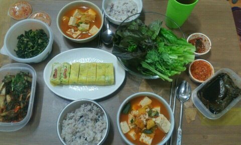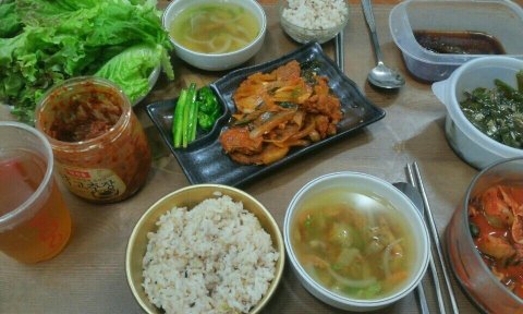 직접 만든 북어국이랑 양념돼지고기와 싱싱쌈!
