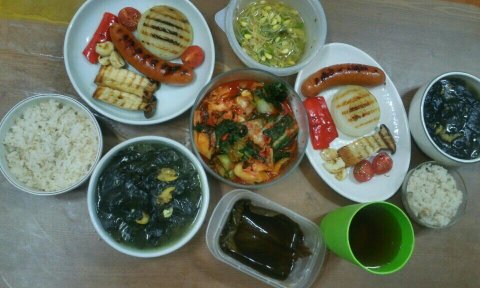 언발란스한 메뉴 선정이지만, 홍합넣고 끓인 미역국이랑 소세지채소구이~ 큰언니가 소세지 좋아해요 ㅋㅋㅋ