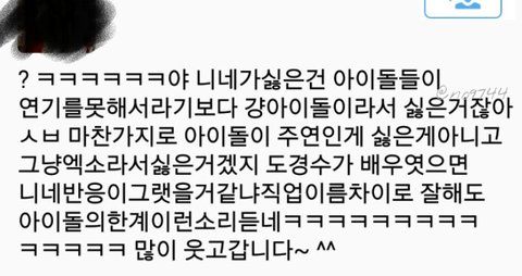 잘씀 그리고 지금 이걸로 뭐라하는년들은 팬 맞냐? 같은 팬끼리 줌줌거리지마 조카 한심해 니새끼만 생각하지말고 ㅋㅋ 니새끼랑 같은 그룹이야 정신좀 차려 팬들이 이러니깐 가수도 욕 먹지 어휴
