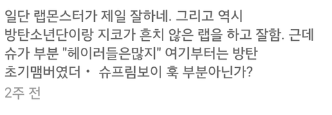 남주니랑 윤기 랩 막 잘한다하고 호석이는 춤으로들어왓는데 어떻게 잘하냐 하구ㅠㅠ
