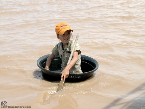 사실 구걸하는 어린아이에게 적선을 베푸느냐 마느냐는 동남아에서 아프리카까지 후진국 어디를 가도 마주치게 되는 문제입니다. 돈을 주자니 계속 발전이 없을테고 안 주자니 불쌍하고... 좀 심한 경우엔 인신매매범들이 납치해서 앵벌이를 시키는 경우도 있고, 부모가 구걸 더 많이해오라고 자기 자식의 손을 잘라버리는 경우도 있습니다. 설마 그렇게까지야 할까 싶은 생각이 들지만, 인도 여행갔을 때 이상하게 한쪽 손만 잘린 채로 구걸하는 아이들이 엄청 많은 걸 보니 도시전설로 치부할 수가 없더군요. 그 정도는 아니더라도 이 바다처럼 넓은 호수에서 김장 담글때나 쓸만한 고무 대야 타고 이리저리 떠돌아 다니는 어린 아이들 역시 안전해 보이지는 않구요.