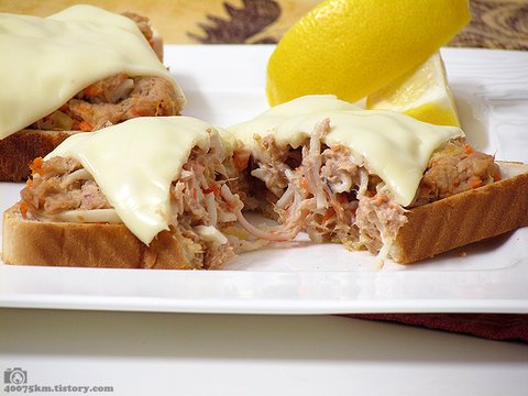 완성된 튜나 멜트. 보통 튜나 멜트 레시피에는 토마토가 들어가는데, 이상하게 제 입맛에는 맞지 않더군요. 뜨근하고 흐물흐물한 토마토가 어울리는 샌드위치도 많지만, 개인적으로 참치 샐러드에 얹어먹기는 좀 꺼려집니다.