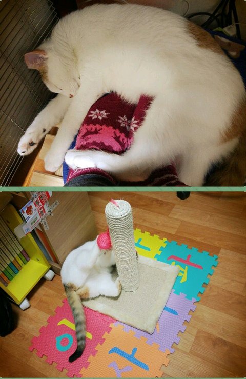 다른 고양이가 그렇듯 세미도 노는거 좋아하고, 장난감 아주 좋아라~ 해요. 실컷 뛰어놀고 힘들다싶으면 바로 저렇게 아무데서나 -- "혼절하셨습니다." --- 진짜 혼절한거같아요 ㅎㅎ
