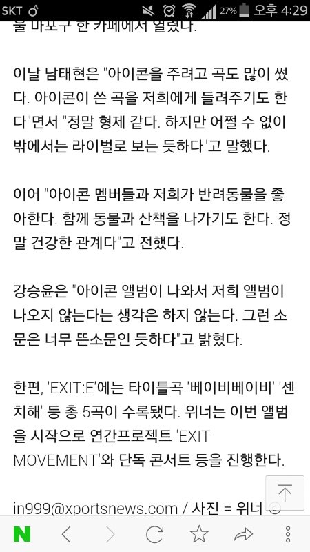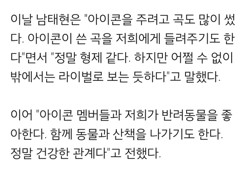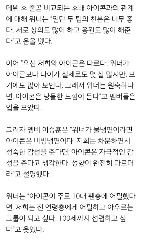 그에 대해 아이콘과 좋은 관계다 위너는 좀 더 성숙한 느낌 아이콘은 당돌한 느낌이다라고 먼저 이야기함