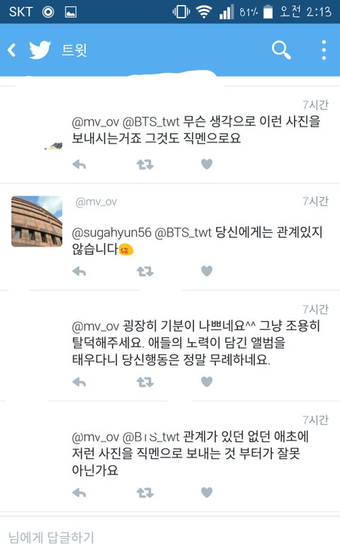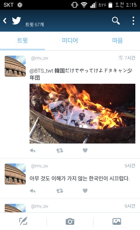 섬녀니까 괜찮지? mv_ov 치고 그냥 검색 누르면 아미들이 멘션보낸거 쭈루룩나오는데 하나 누르고 아이디 누르면 돼 얘 정신이 좀 이상한데 뭐 방법없나? 방탄한테 직멘을 보냈다고 ㅠㅠㅠㅠㅠ저 사진태우는걸.....미친년진짜 애들이 보면 어떡해 볼수도 있는데
