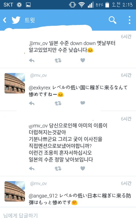뒷북인데 트위ㅌ에 저섬녀 아이디 검색해서 봐봐ㅋㅋㅋㅋ사진 올리고 한국아미들이 뭐라뭐라하니까 성기같은이모티콘 하나하나 붙이면서 하나하나답멘션보내는데 조카뺨때리고싶어 일본어번역눌러서 봐봐 글삭하라하면 글삭할게ㅠㅠ 너무화나서