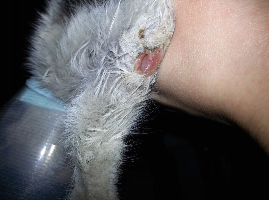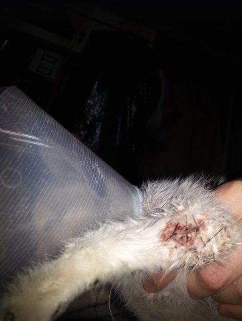 며칠후 또 사건이 생겼어요. 가끔 상태를 보러 병원에 가는데 고양이 발바닥에 모래가 굳어 붙어있는걸 저는 신경 안썼는데 원장님은 피부에 좋지않다며 당분간 배변 패드를 쓰라고 하셨어요. 붙어있는 모래도 물에 불려서 씻어내라고 하셨죠. 전 초보라 매장에 가니 제일 좋다는 벤토나이트 성분의 모래를 사용했어요. 그래서 집에서 씻기는데 왼쪽 앞발을 씻다보니 얘가 발버둥을 치는거에요. 그래서 보니 헐..... 다리에 저런 구멍이 있고, 화장실 모래가 굳어 그 구멍을 메우고 굳어 있었던거죠... 저는 또 병원에 바로 달려갑니다... 먹는약, 바르는 약으로 안되니 마취하고 꿰매야 한다는군요. 월요일에 마취하고 꼬리 수술했는데, 수요일에 또 마취하고 꿰매고....