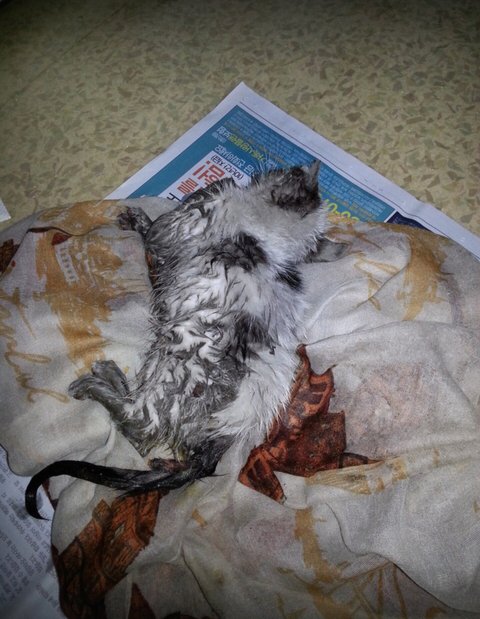 (그날은 기분이 붕 떠있는거마냥 마음이 어딘가 편치않았어요. 이유도 없었어요. ) 2014년 11월 28일 금요일 제가 사는 인천 이곳은 아침부터 비가 추적추적 내렸어요. 저는 도보 30여분 거리에 있는 수봉공원에 밥을 주는 캣맘이에요. 목요일 저녁에 밥을 준게 좀 모자란다싶기도했고, 친구가 금욜에 월차를 내고 저희집에 놀러오기로 했는지라 비가 올지라도 수봉공원에 가기로 약속을 했거든요. 집에서 나서면서 공원쪽으로 가려는데 그날따라 이상하게 발걸음이 안떨어지는거에요. 공원을 가려고 나서긴했는데 이상하게 안가고싶더라는거죠... "그냥 주안역 나가서 밥이나 먹자." 하고 반대편 길로 내려오는데 한 20미터 걸었나... 친구가 그러는거에요. "저게 뭐야?" 도로변 길가에 송전 박스? 케이블 박스인지 사람 어깨 높이되는 큰 회색 박스밑에 뭐가 시커먼게 둘둘 뭉쳐져 있는거에요. 종이뭉치 같았어요. 근데 자세히보니 종이뭉치인지 동물인지, 그것도 개인지 고양이인지, 새인지도 모르게 비에 젖은 뭔가가 머리도 안보이고 잔뜩 웅크리고 있는거에요. 움직이지도않고, 얼굴도 안보이고, 뭔지도 모르죠...