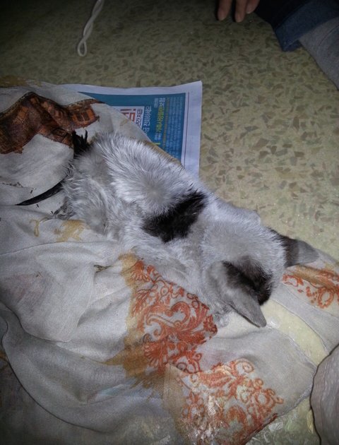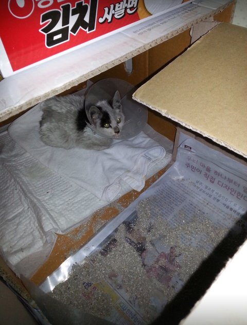 저런 자세로 엎어놓고 친구랑 열심히 닦이고 말리고있는데 이 새끼 고양이는 저렇게 엎어진 자세로 꿈쩍을 안하고있는거에요... 죽은줄 알고 손으로 콕콕 찔러봐도 미동이 없고, 콧김으로 알았죠... 지금 생각해보면 얘도 사람에 경계를 할법한데 많이 아프고 힘들었던가봅니다 ㅠㅠ급한대로 박스를 주워오고, 친구는 있는지도모를 손난로를 사러 나가더니 다행이도 사온거있죠.