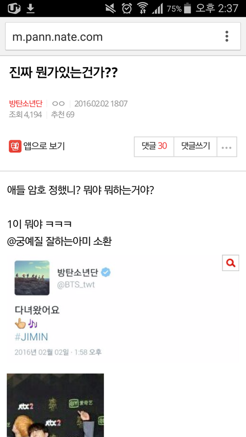 저 글에 사진이 몇개 있는데 짐니가 이모티콘 쓴거랑 멤버들이 하늘 가리키는 제스쳐로 사진 찍은거 몇장이 올라와 있거든?