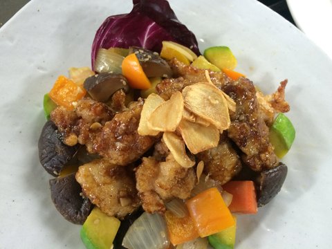 다양한 야채와 닭을 튀겨서 만든 치킨요리입니다.