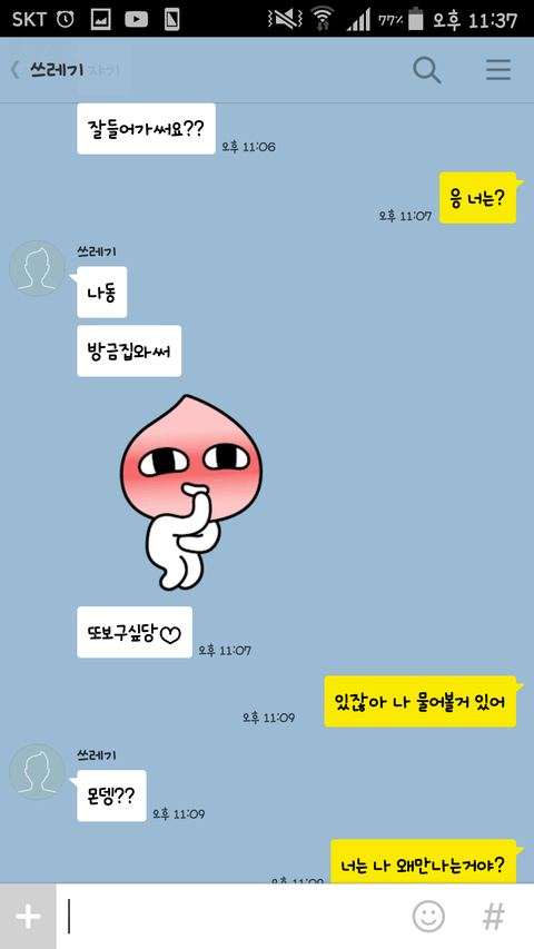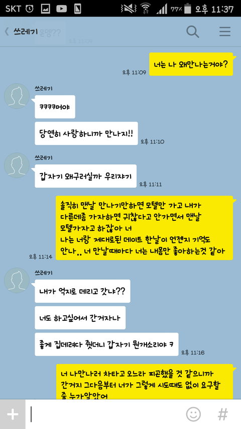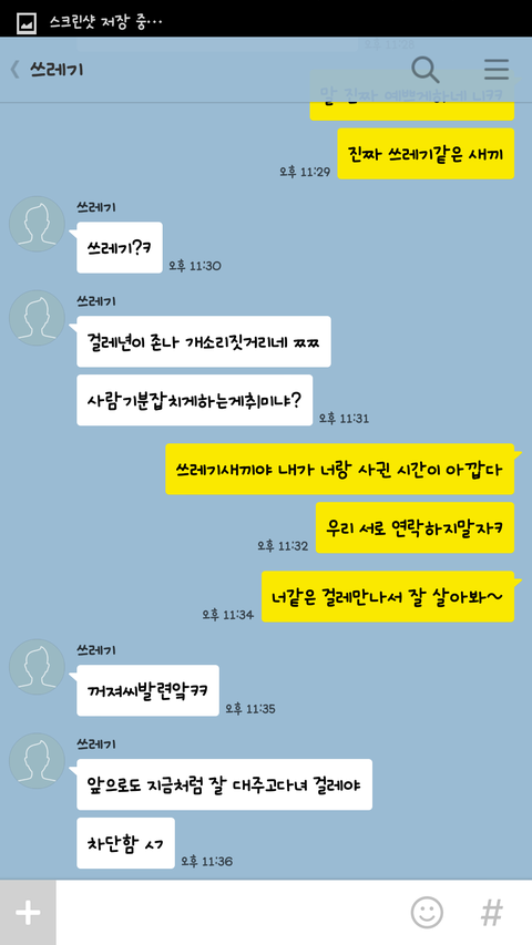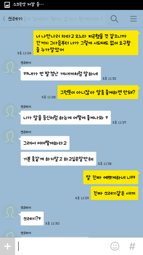 헐.. 얼마나 사귀셨나요 이카톡내용 사실이에요? 저새끼 몇살이에요?... 무슨 말하는게 고딩마냥..저런애들이 존재하는구나..소름끼쳐요진짜ㅠ 시간낭비하지마세요 잘헤어지셨어요 여자친구한테 수건년이라니 또라이새끼;;