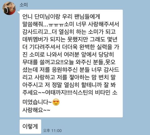 식스틴 탈락 후 지인에게 보낸 카톡임 처음부터 나이때문에 본인 탈락할거 알고있으면서도 끝까지 최선을 다한앤데 뭔솔 건성으로 부른게 아니고 소미가 리듬을 빨리타서 연습할때는 그렇게 들릴수도 있지만 본무대에서는 전혀 안그러잖아