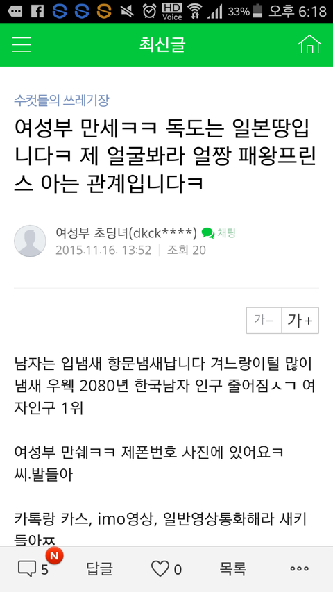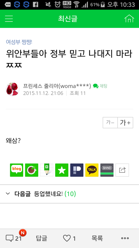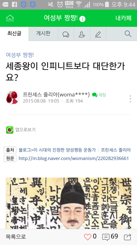 안녕하세요 판을 보기만했는데 글을 쓰는건 처음에네요. 다름이 아니라 여성부짱짱카페에 관한 것인데요, 여성부 지지를 벗어나 위인들을 욕하고 있네요. 현재도 여성부짱짱카페가 있습니다.