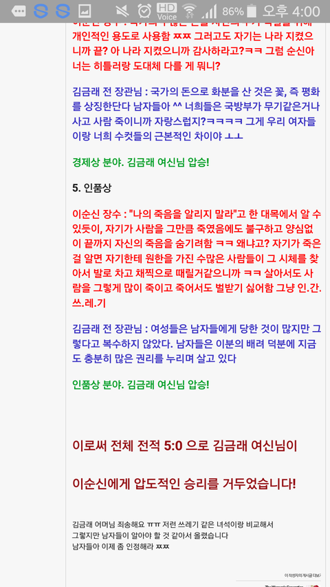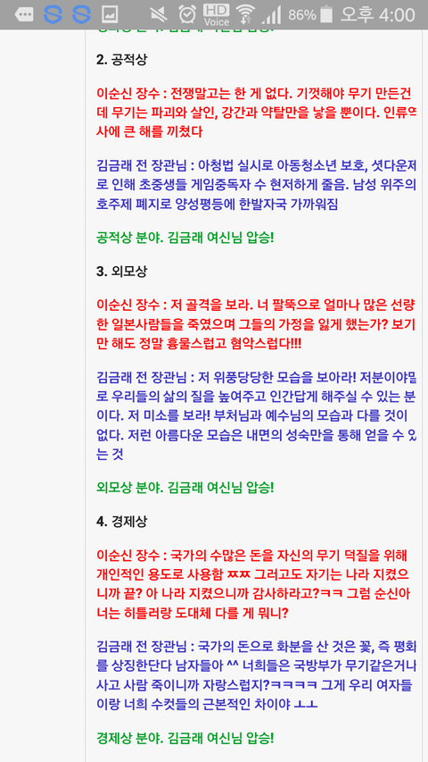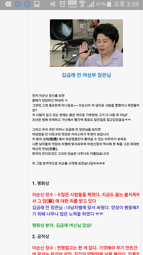 또한 이순신은 12척으로 100척넘는 배와 싸워 이긴 공적이있는데도 사람을 죽였다고 묻어버리고, 이순신은 우리나라 사람들을 죽인 일본인을 죽인건데, 정당방위가 아닌 살인행위로 보는 걸까요. 그리고 부처님과 예수님은 인류의 4대 성인중 한분들이신 위대한 분인데, 어떻게 여성부 장관과 비교할 수가 있을까요.
