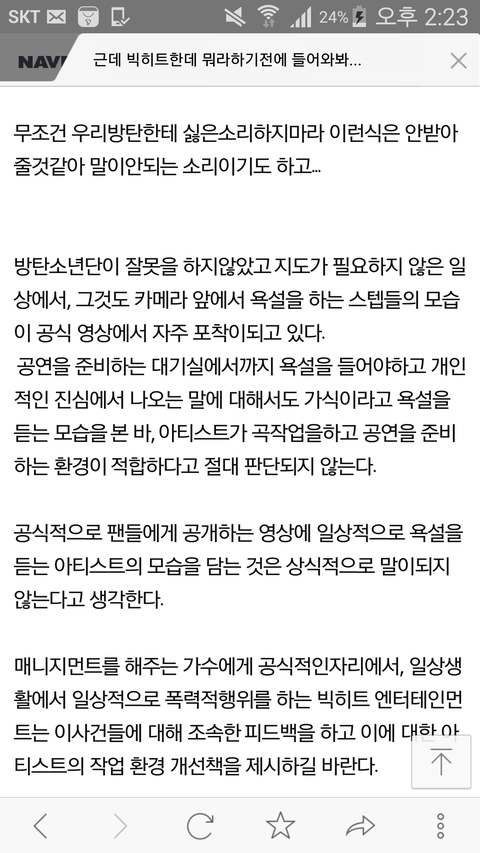 개인적으로 방탄소년단한테 안좋은소리 무작정하지마라 우리오빠들한테 왜혼내냐 이러는거 무식해보여..연예계얼마나 험한지알잖아....
