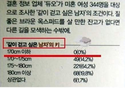 키만 놓고 보면 당연히 작은 거 보다야 큰 게 좋지. 근데 사람을 볼 때 키만 보는 사람이 어딨어. 전체적으로 보는 거지. 그니까 남자들 제발 이거 보고 키 작다고 열폭하고, 키 크다고 근자감 갖지 않았으면... 키는 그냥 키일 뿐이야. 너네가 발전시킬 수 있는 다른 요소도 얼마든지 많은데 걱정고민한다고 한 치도 자라지 않을 키에 너무 마음 쓰지 마라.